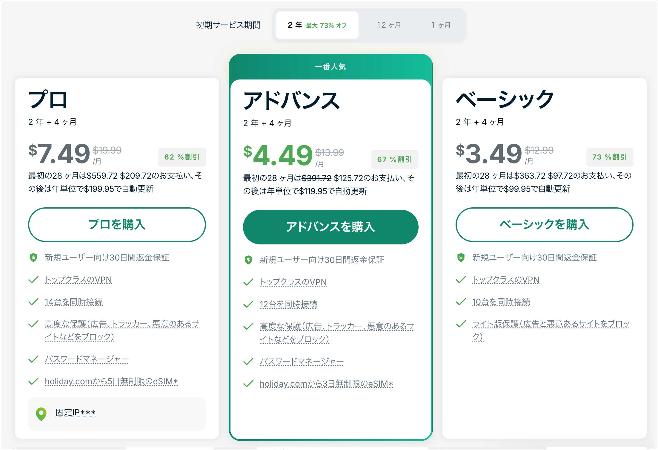 「アドバンス」には、eSIM(3日間)や、パスワードマネージャー機能が付いています。