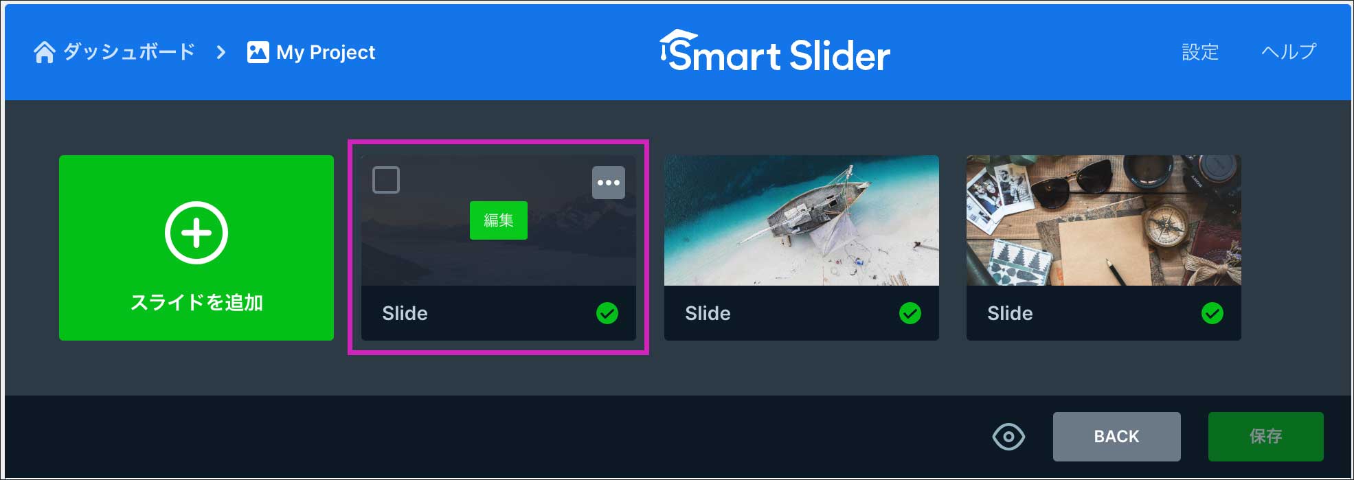 スライダー設定ページで、編集したいスライドをクリックすると『スライドエディター』を開くことが出来ます。