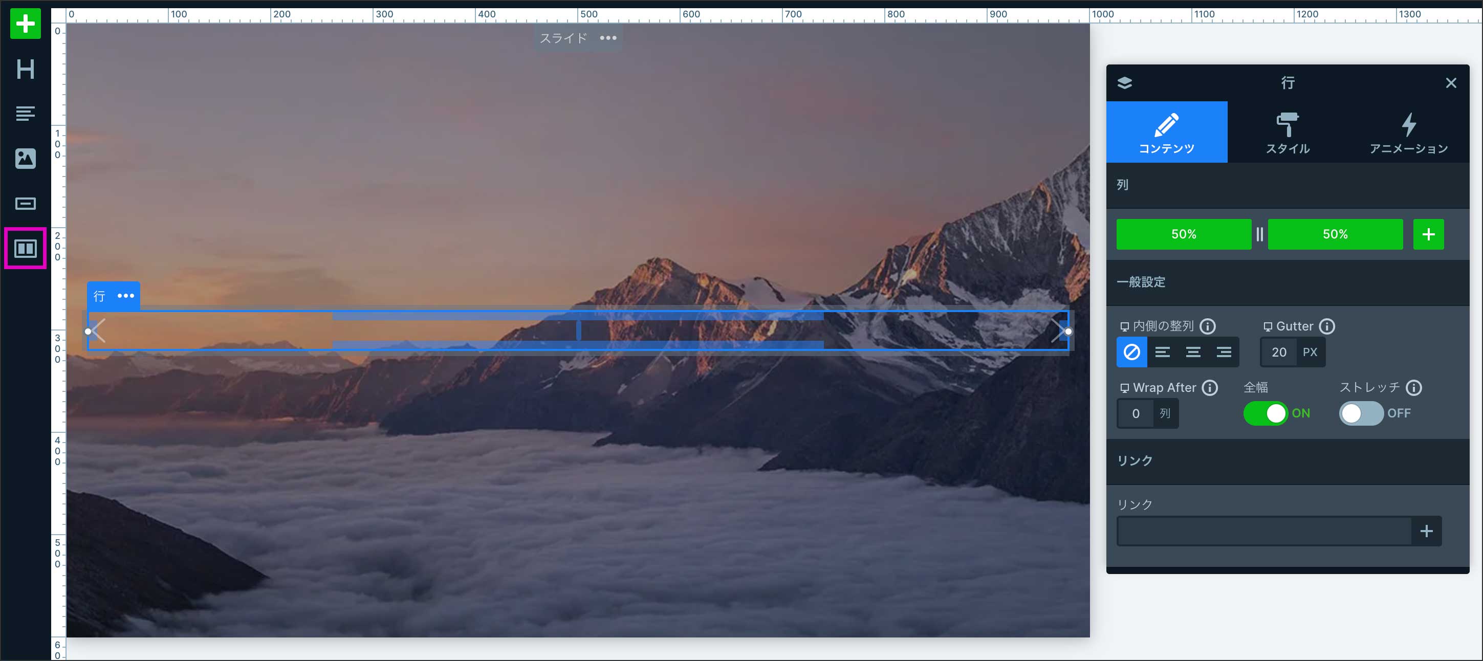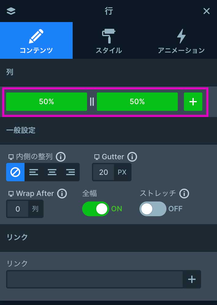 マウスドラッグで、2つの列幅の割合を変更したり、順番を入れ替えたりが可能です。また、プラスボタンで列の数を「3列、4列 … 」と増やすことも出来ます。