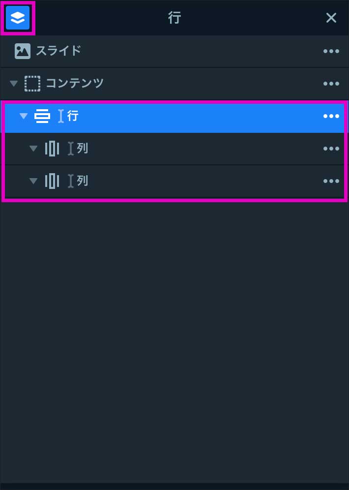 右上のボタンからレイヤーリストを開くと『コンテンツ』枠の中に『行と列』が格納されているのが分かります。クリックして、各要素を選択することも出来ます。