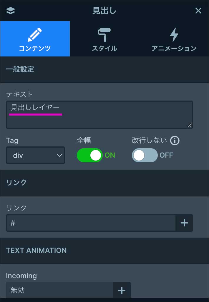 そして、内側の『コンテンツ』枠の中に、『見出し・テキスト』『ボタン』『画像』などの要素をレイヤーとしてレイアウトしていくことが出来ます。