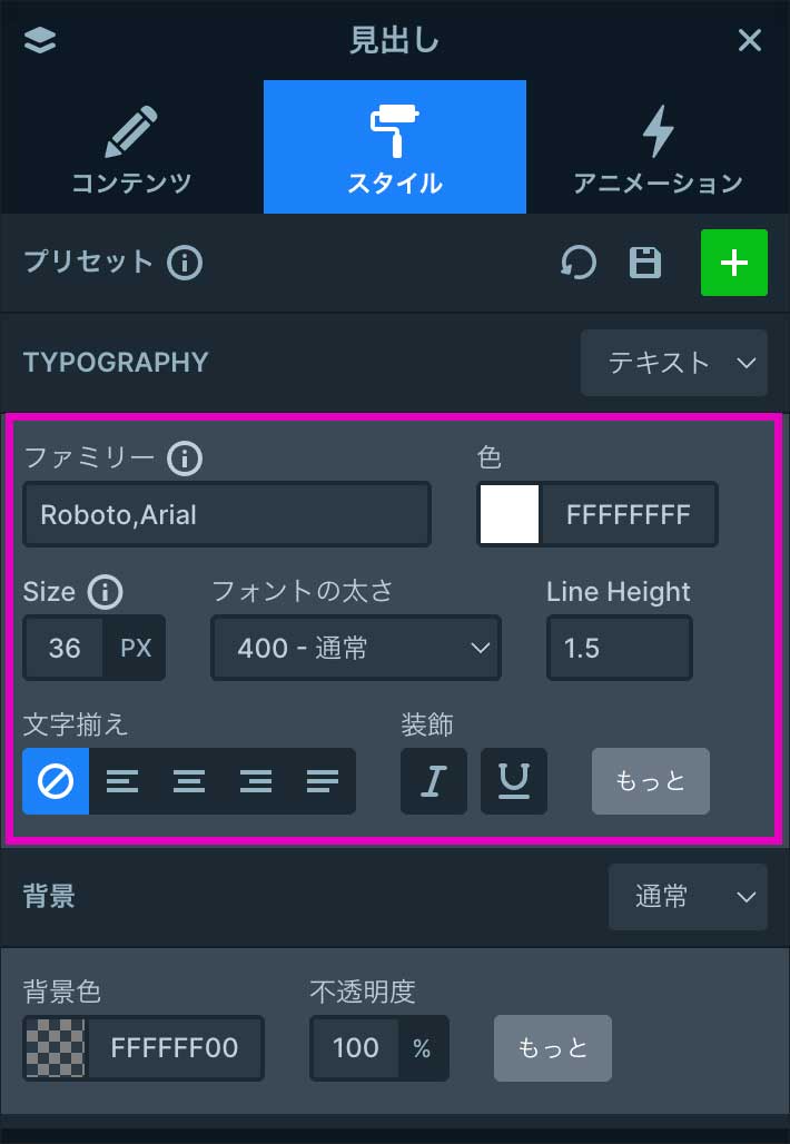 フォント、色、サイズなどの文字設定は「スタイルタブ」から行うことが出来ます。