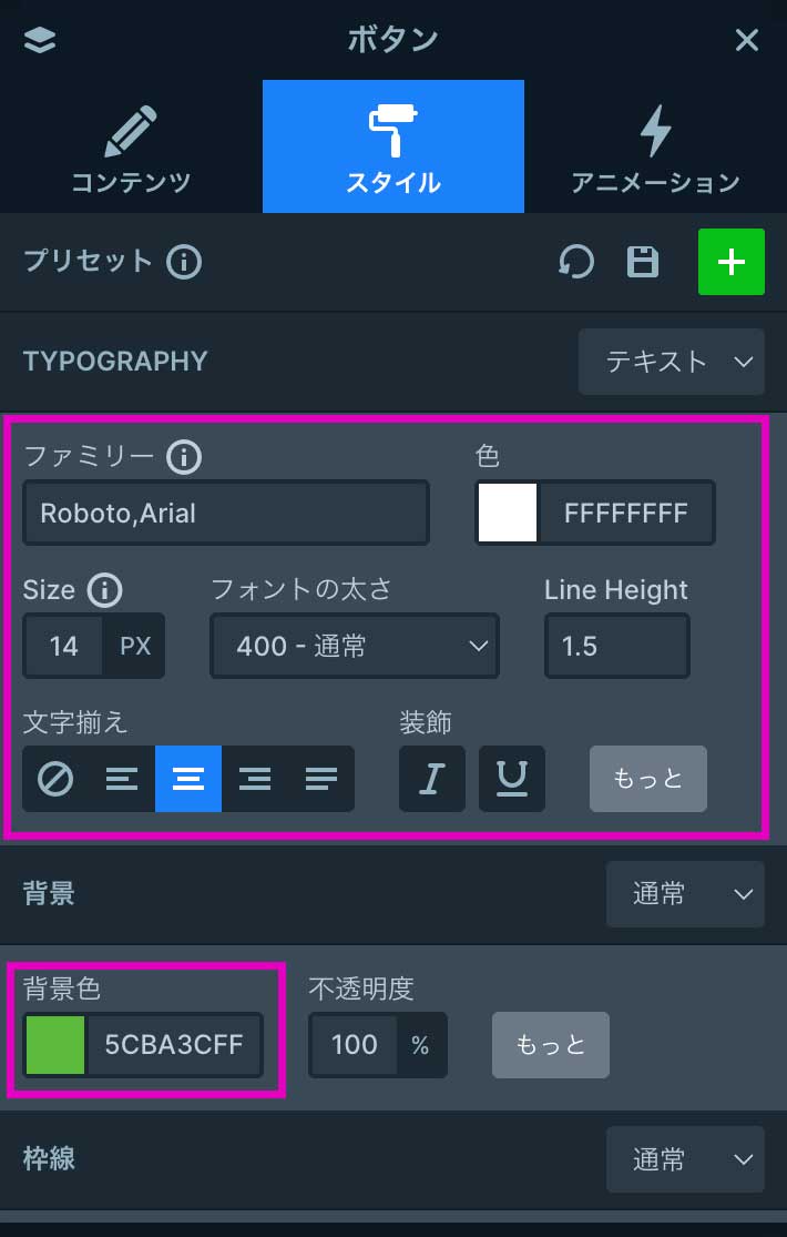 ボタンや文字の色など、見た目の変更は「スタイル」タブから行うことが出来ます。