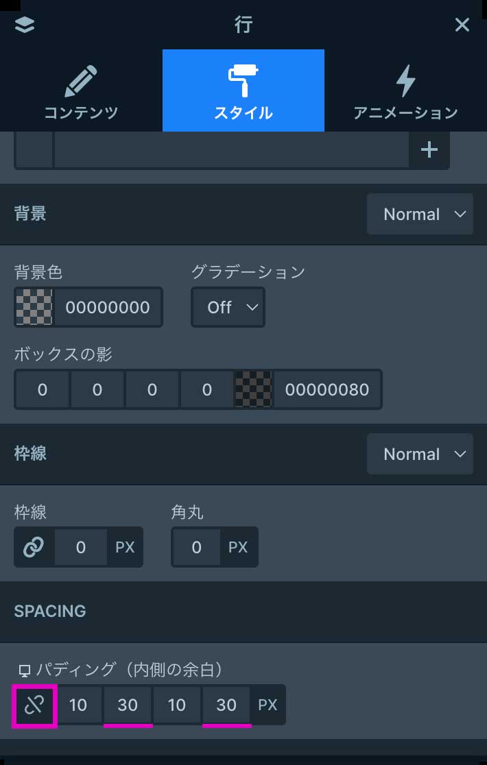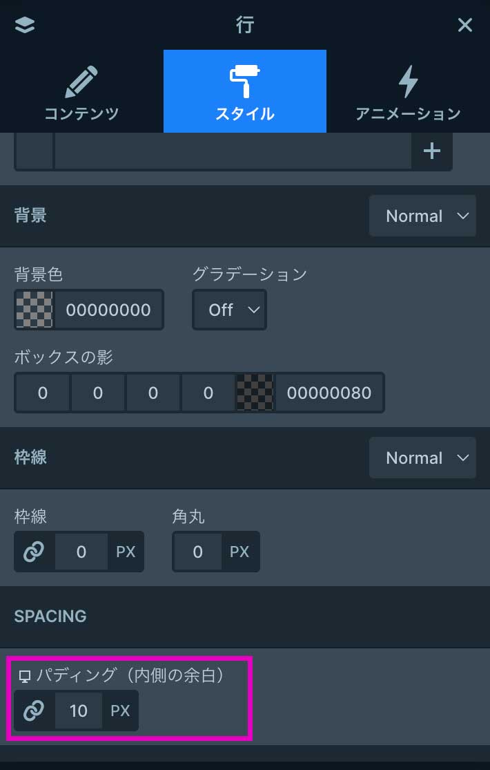 まず、『行』レイヤーの左右の内側の余白(パディング)を広げて、全体のボリュームをもう少し中央に寄せてみます。