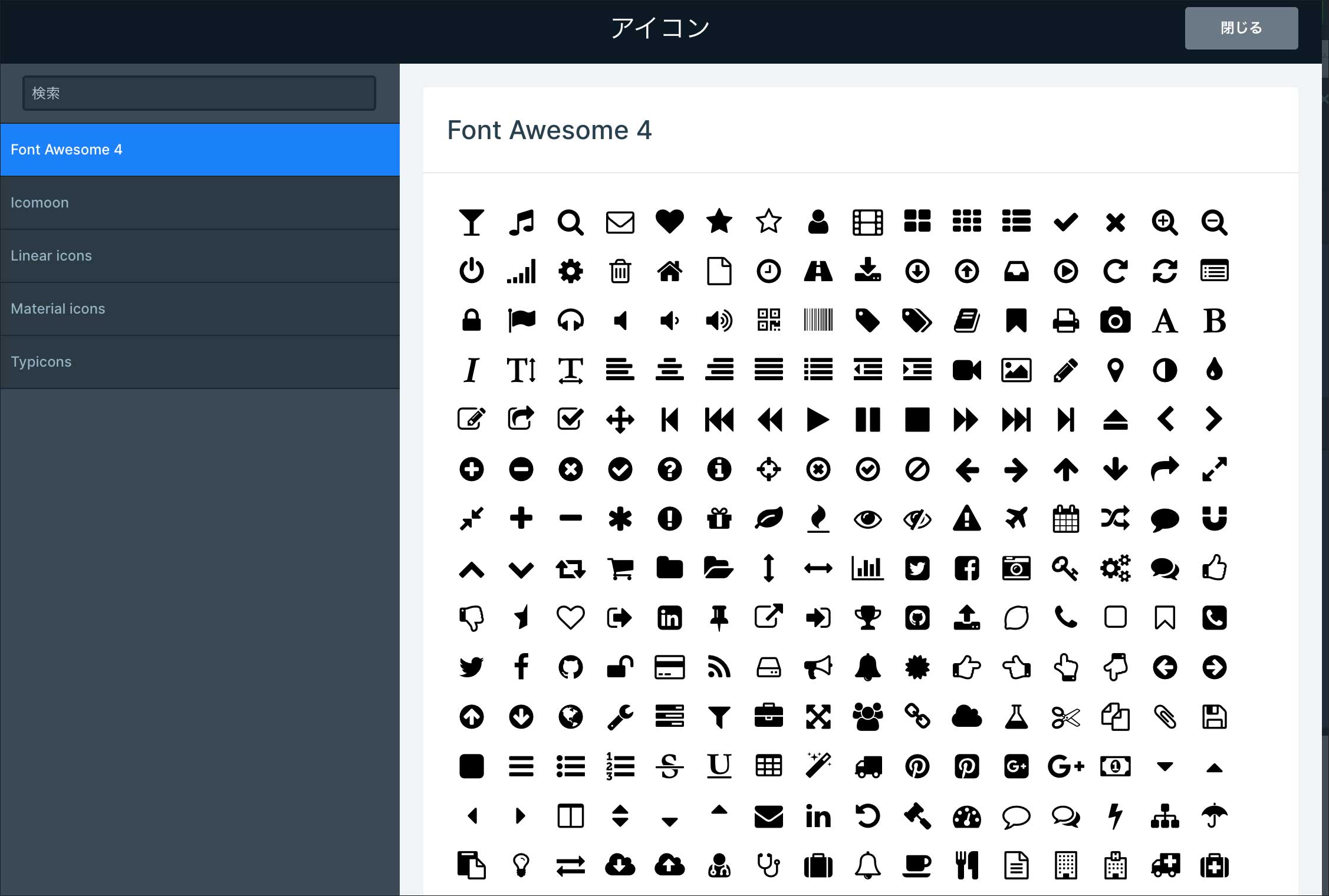 Font Awesomeなど、有名なアイコンストックサービスのものから、自由に選択できるようになっています。