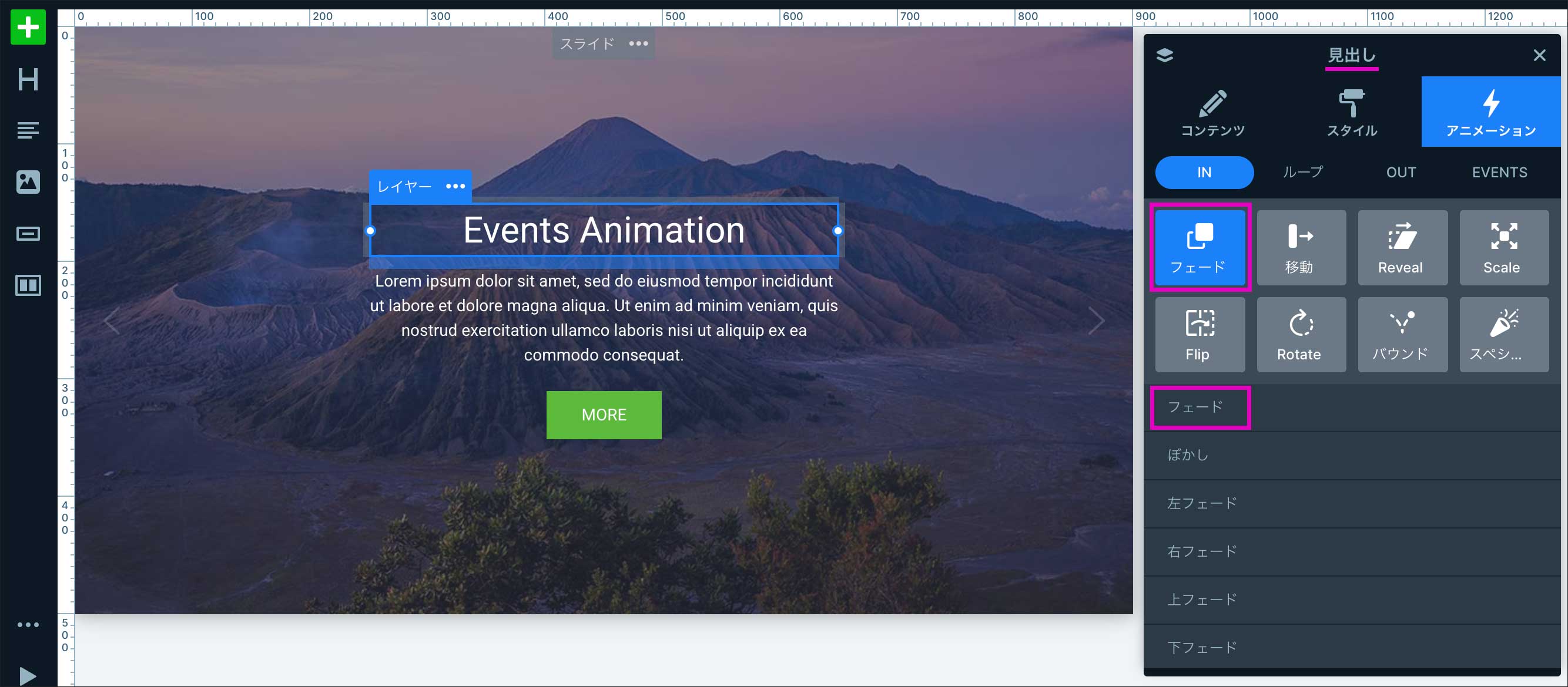 それでは、『見出し』レイヤーに、「フェードイン」「フェードアウト」の2つのアニメーションを設定し、それらをマウスイベントによって発動させる設定の流れを解説していきます。