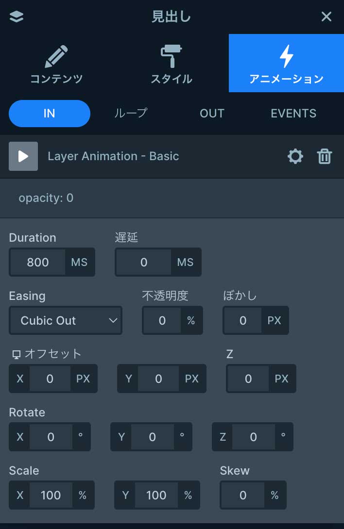 』レイヤーに「IN」と「OUT」のアニメーションを設定できたので、次はイベントを定義していきます。