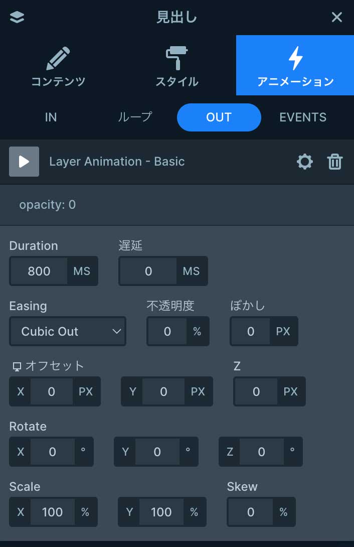 続いて「OUT」の動きの設定ですが、「OUT」には「移動→左」という選択肢がないので、いったん「フェード」を選択します。アニメーション設定画面に切り替わったら値を変更していきます。