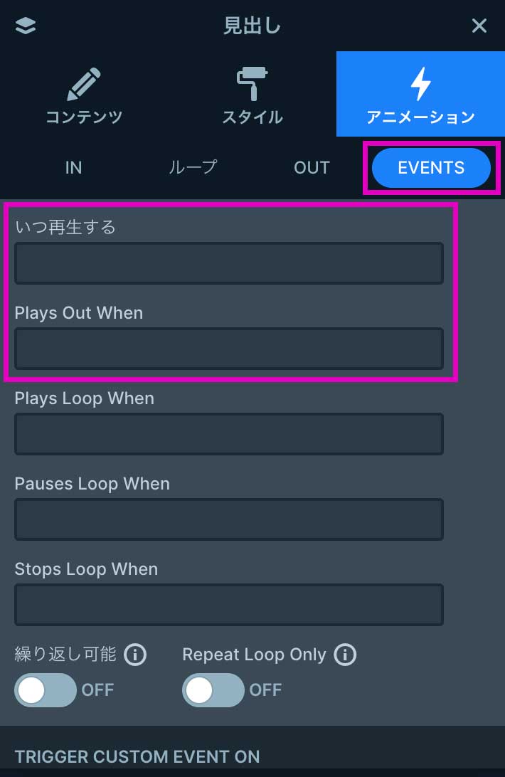 そして『EVENTS』タブで、「IN」と「OUT」2つのアニメーションを発動させる条件をそれぞれ設定していきます。