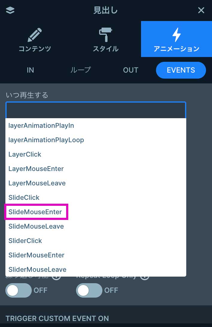 プルダウンを開き、定義済みのイベントの中からイベントを選択できます。ここでは「SlideMouseEnter」(マウスカーソルがスライド領域に入ったとき) を選択します。