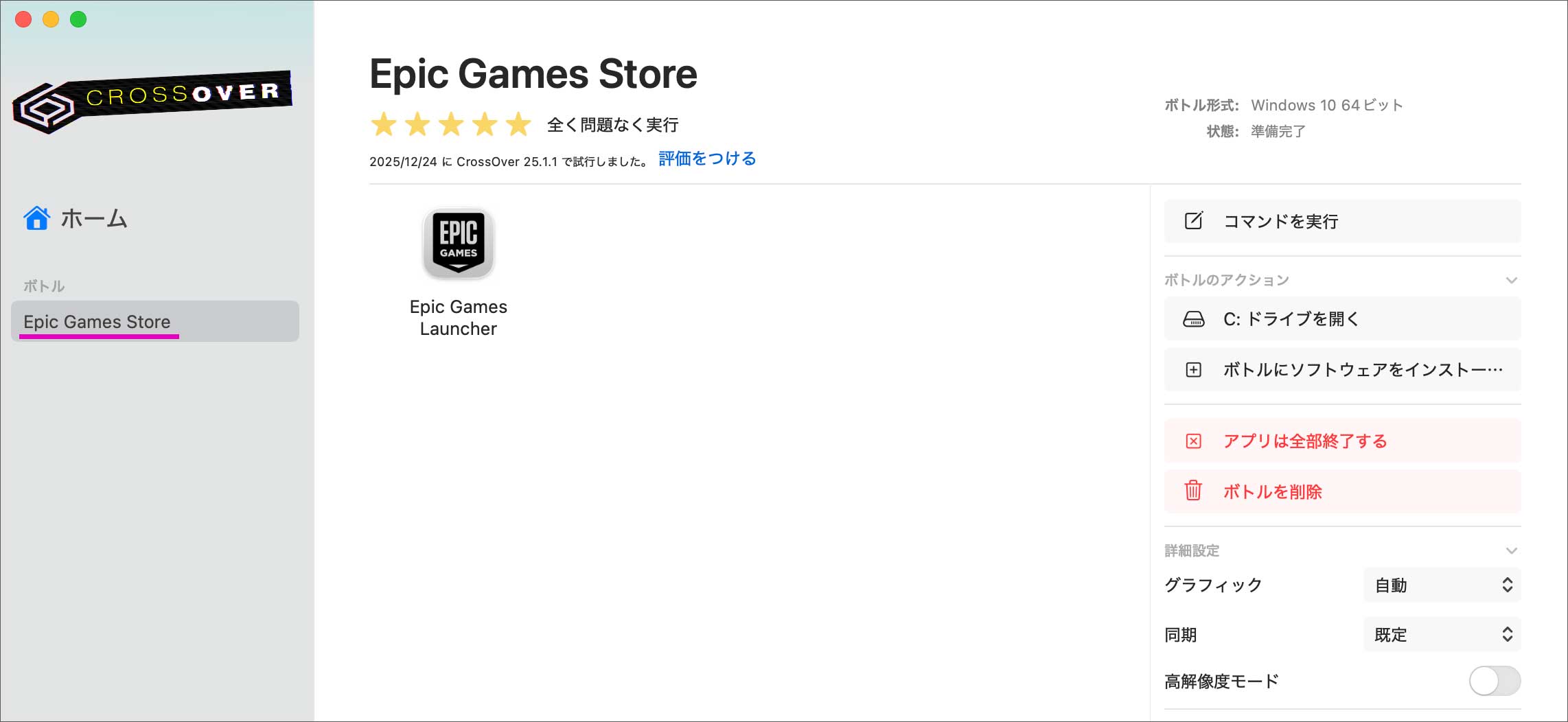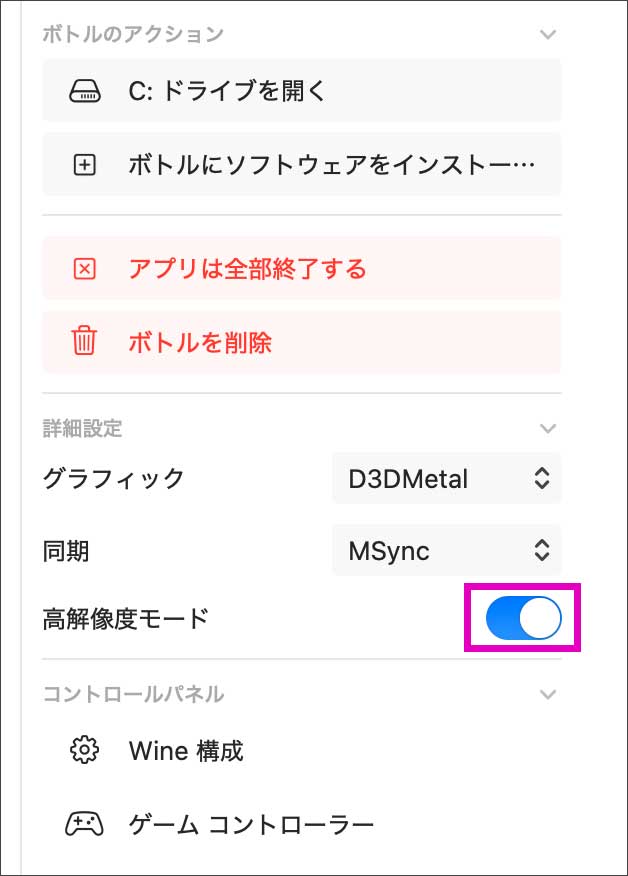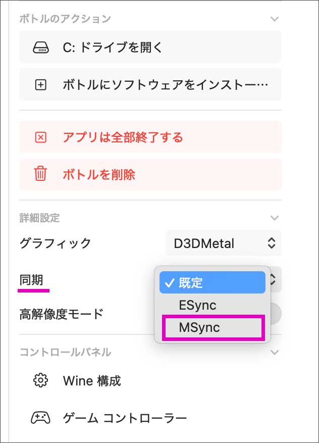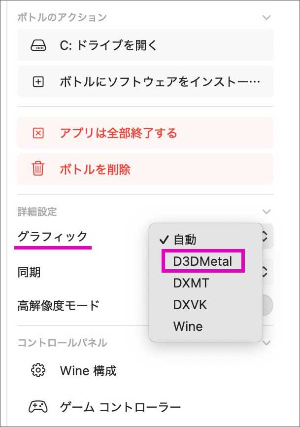ここで、右側の「詳細設定」を少し変更します。まず、グラフィックを「D3DMetal」に変更。