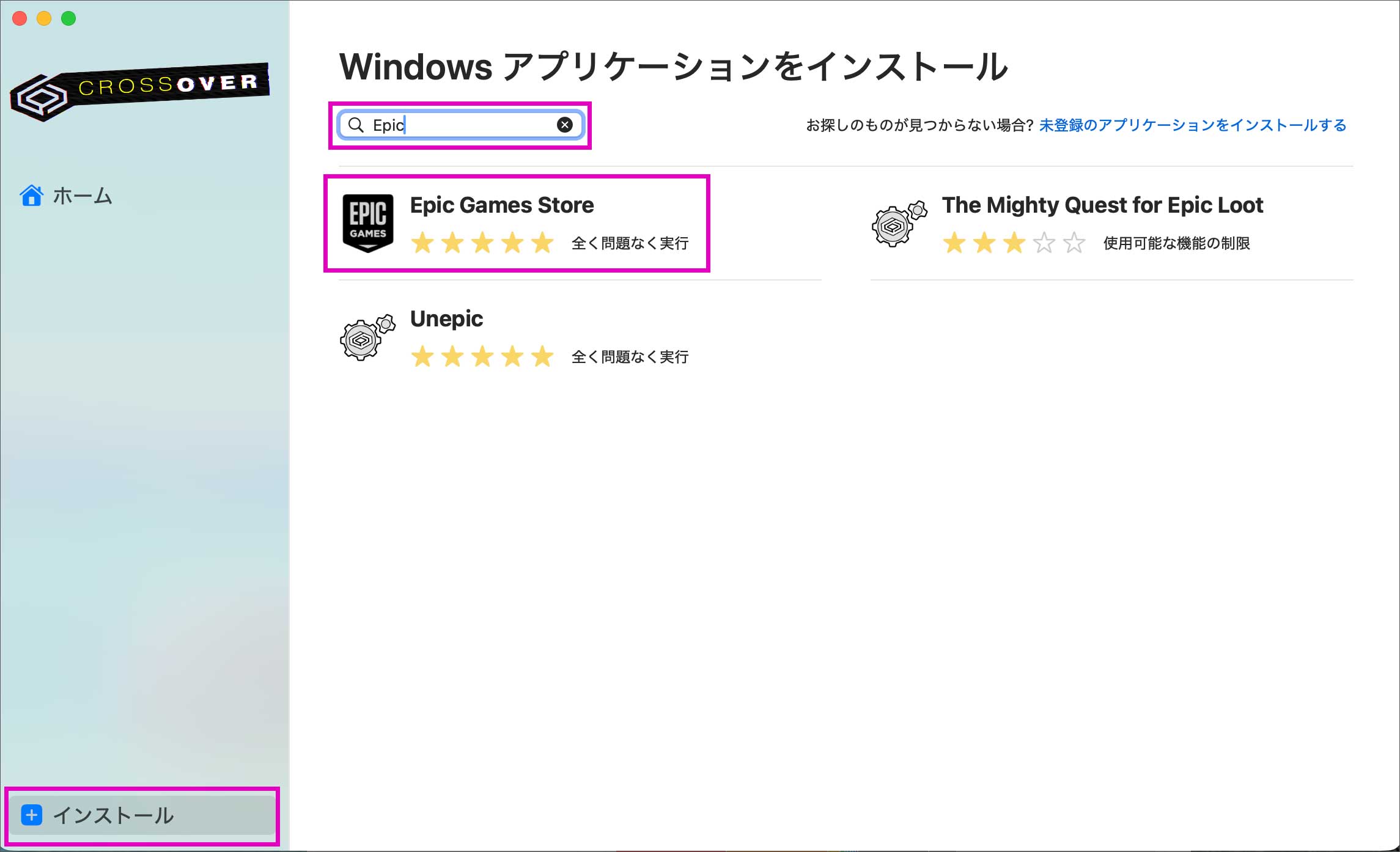 画面左下の「インストール」を押して、サーチ窓から「Epic」と入力すると、