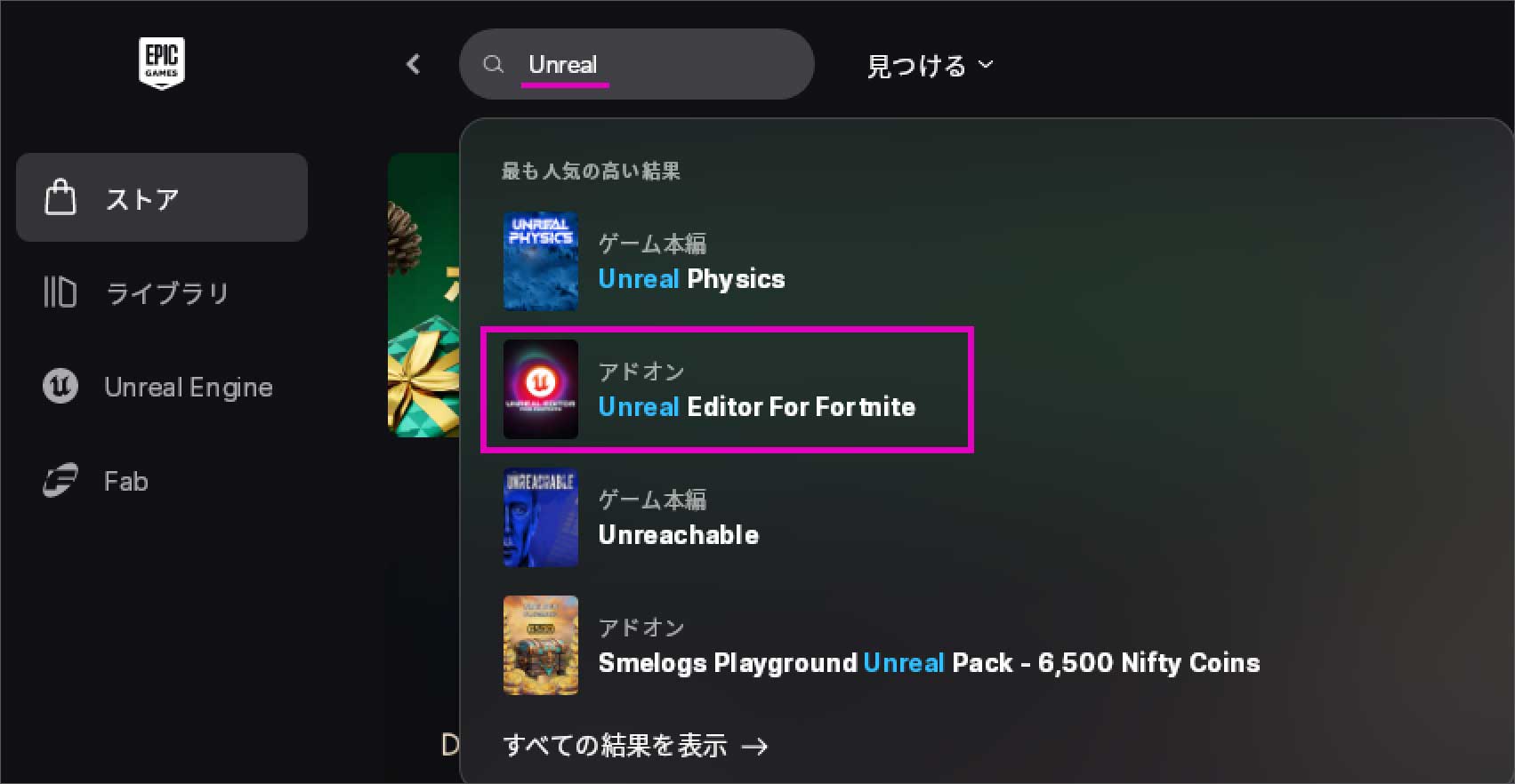 「Epic Games Launcher」が起動したら、「ストア」のサーチ窓に「Unreal」と入れます。