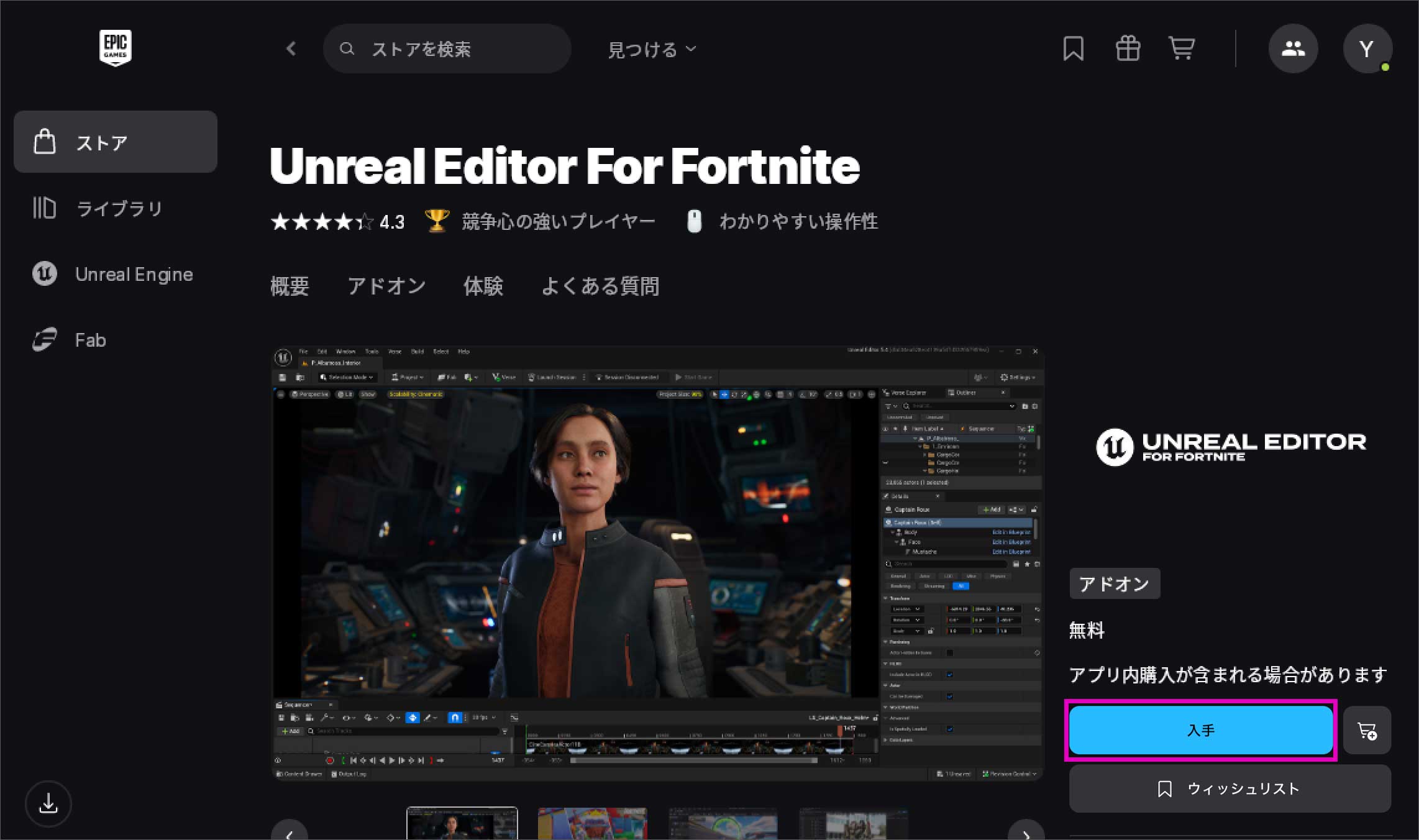 「UEFN」のストアページが開くので「入手」を押します。