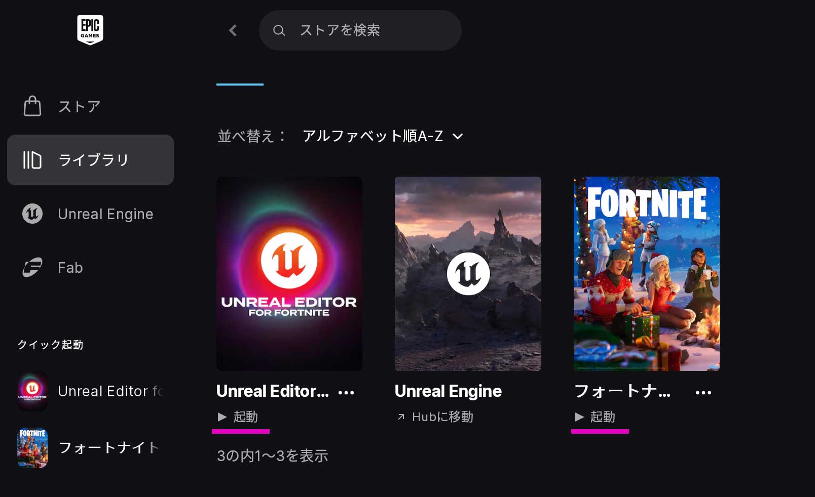 「UEFN」の方の「起動」を押せば、「UEFN」が立ち上がります。
